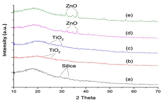 - The SEM/EDS confirmed the uniform distribution of samples, whereby the XRD pattern of the ZnO-based samples showed characteristic peaks corresponding to the hexagonal phase with a wurtzite structure, and the anatase phase was confirmed for the TiO2-based samples;