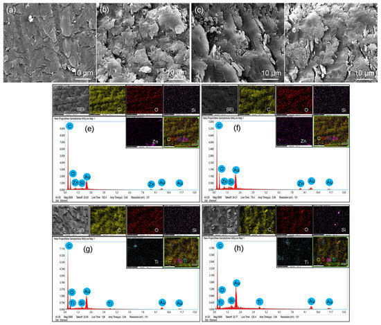 Comparison of SEM images: (a) EC-Z1, (b) EC-Z2, (c) EC-T1, and (d) EC-T2. EDS spectra and EDX mapping of (e) EC-Z1, (f) EC-Z2, (g) EC-T1, and (h) EC-T2. The EDS spectra confirmed the presence of Zn and Ti in EC. The gold peak appeared due to the gold-coating of the samples. The EDS mapping images show the distribution of ZnO and TiO2 nanoparticles in EC. The scale bars are 10 µm (a–d) and 20 µm (e–h) for the mapping images.