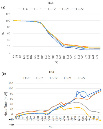 - The TGA and DSC curves showed that the thermal decomposition and glass transition temperature increased with higher concentrations of nanoparticles, indicating a strong molecular interaction of organic–inorganic components. The sequence of weight loss (%) was EC-C > EC-T1 > EC-Z1 > EC-Z2 > EC-T2, whereby the initial degradation temperature was in the order: EC-Z2 > EC-Z1 > EC-T1 > EC-T2 > EC-C. The observed sequence for Tg was above the range of the intraoral temperature;
