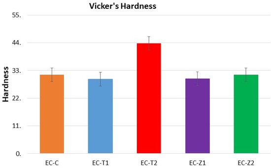 The comparative means and standard deviation values of the micro-hardness of the composite groups are shown in Figure 5. The observed sequence was EC-T2 (43.76 ± 2.78) > EC-C (31.33 ± 0.92) > EC-Z2 (30.18 ± 2.35) > EC-Z1 (29.71 ± 2.09) > EC-T1 (29.58 ± 3.23). The statistical analysis revealed a significant difference between all groups with a p-value ≤ 0.05. There was a significant difference (p = 0.000) between EC-C and EC-T2 as well as EC-T1 (p = 0.00). EC-T2 had a significant difference with all groups at 0.00 values. EC-Z1 had a significant difference with EC-T2 at 0.00 values, and EC-Z2 had a significant difference with EC-T2 at 0.00 values. The results show that EC-T2 had the highest Vickers micro-hardness and EC-T1 exhibited the lowest. The normality of the data was assessed by the Shapiro–Wilk test, and the results revealed that the data were normally distributed.