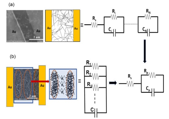 where  is the angular frequency. The resistance Rs is associated with contact resistance and includes resistance between the metal pads and the MWCNTs that are in contact with it. In the case of high packing density devices, the dispersion of the MWCNTs in the network is not homogeneous. Therefore, each device can be treated as having CNTs in small clusters (highly conducting islands of CNTs) and electrical transport occurs between neighboring clusters by electron tunneling between them with negligible capacitive contributions. Figure 1b is an SEM image and a schematic of one such device that shows small clusters of CNTs connected to each other through a few conducting arms of individual CNTs that assist with electron tunneling []. The conducting arms are represented by resistors R1, R2, … in parallel (Figure 1b). The capacitive contribution in this case is from sufficiently separated clusters that does not permit efficient tunneling. The total device resistance is a sum of the equivalent resistances R and capacitances C, defined by a simple parallel resistance and capacitance Rp and Cp model. In both cases described in Figure 1, the randomly dispersed MWCNTs in the network can be modelled by a single relaxation time model with relaxation time,  defined as . Following the impedance analysis described by Helseth [], the real and imaginary parts of impedance can be expressed as []: