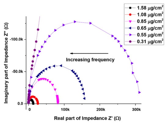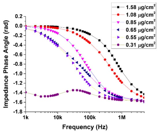Figure 3 shows the variation of phase angle with frequency for the six devices. The imaginary part of the impedance represents the reactance (loss factor) and is related to the capacitive behavior of the device. As seen in the plot of Figure 3, devices with high MWCNT content showed no peaks (loss peak or relaxation peak), whereas a single peak is observed at the low MWCNT concentration of 0.31 µg/cm2. The absence of loss peaks at higher packing densities indicates that there are no relaxation processes at these concentrations in the measured frequency range.