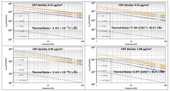 where .  is the Hooge constant, and n is the number of charge carriers. After subtraction of the thermal baseline, the excess noise was found to vary as . The dashed line in each of the plots is a  noise line. For all devices, the exponent  was found to range between 1.05 ± 0.02, revealing a  behavior induced by resistance fluctuations []. Due to limitations in our experimental setup, we were unable to perform noise measurements at kHz frequency. However, extrapolation of the data shown in Figure 8 shows that at high frequencies of the order of few kHz, the  noise amplitude will approach or become lower than the thermal noise.