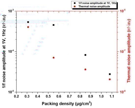 Dependence of  noise amplitude (at 1 V, 1 Hz) and thermal noise on packing density of CNTs in the network.