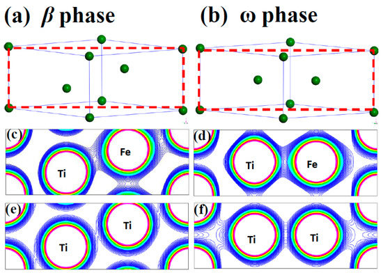 The atomic configurations of (a) β phase Titanium and (b) ω phase Titanium. And the Charge density of plane indicated as the dash line rectangle in (a) and (b) for Fe-doped β phase Titanium (c); Fe-doped ω phase Titanium (d); β phase Titanium (e) and ω phase Titanium (f).