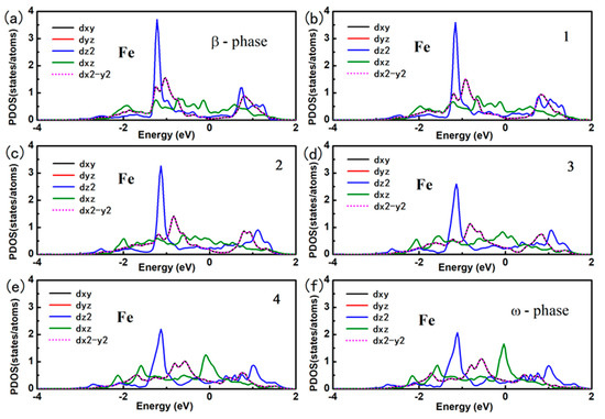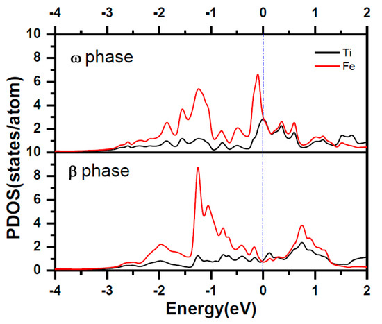 Here, Etot (Fe, x) refers to the total energy of Fe doped in x phase titanium. E (Ti, x) is the total energy per atom with x phase. And E (Fe) is energy per atom of Fe in BCC structure. we use the formation energy for per Fe atom to identify the stability of the Fe doping in different phase of titanium alloy. The formation energy for per Fe atom doped in deferent phase of titanium alloys are calculated as: 0.58 eV, −0.03 eV and 0.88 eV for Fe doped in α, β and ω phase titanium, Clearly, the substitution Fe prefers to dope in the β phase titanium, indicating that the Fe is a β stabilizer element. The contour of the charge density distribution for Fe doped β and ω phase of titanium are shown in Figure 1, contours start from 2.0 × 10−5 e/Å3 and increase consecutively by a factor of 1.2. The position of substitution site labeled as Fe are indicated in Figure 1c,d. For comparison, the contour of the charge density distribution for β and ω phase of titanium are also shown Figure 1e,f. The results show that the charge density and interactions between Ti-Ti in the β-phase are much weaker than those in the ω-phase The results show that the charge density and interactions between Ti-Ti in the β-phase are much weaker than those in the ω-phase Therefore, the titanium in the β-phase is more unstable than that in the ω-phase. Obviously, the charge density between the Ti-Fe is much more than between the Ti-Ti in β and ω phase titanium. The charge density between Ti-Fe for Fe doped in β phase titanium is still a little bit smaller than that for Fe doped in ω phase titanium. However, Fe atom has eight nearest neighbor Ti in β phase while there is only three nearest neighbor Ti in ω phase. This difference results in the stability of Fe doped in β phase and ω phase titanium. To further investigate the interaction between the Fe and Ti in β phase and ω phase titanium, we give the atomic projected DOS of Fe and Ti in Figure 2. We draw the partial DOS of four points on the ω-β transformation path in Figure 3 and Figure 4 when a 2 × 2 × 2 supercells is doped with one Fe atom. There is a resonance peak near the Fermi level for Fe and Ti for Fe doped in ω phase titanium while the resonance peak locates at 1.4 eV lower the Fermi Level for Fe doped in β phase titanium. The height of the resonance peaks indicates the strength of the hybridization between the Fe atom and Ti atom and the position of the resonance peak refers to the hybridization energy level. The lower energy lever and the stronger hybridization strength means the stronger interaction between atoms. From the PDOS shown in Figure 2, Figure 3 and Figure 4, we conclude that the interaction between Fe and Ti in β phase is much stronger than that in ω phase, which is responsible for the lower energy for Fe doped in β phase titanium.