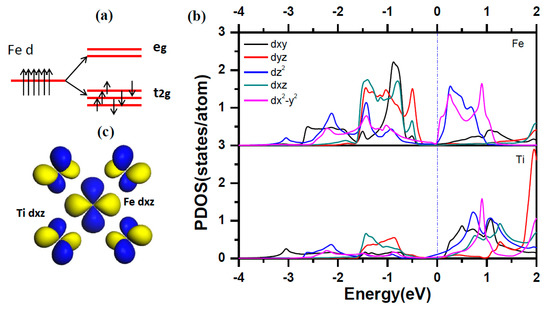 (a) The description of d orbitals in octahedral crystalline filed. (b) The orbitals projected density of states for Ti and Fe in Fe-doped β phase titanium. (c) the charge density distribution for description of the interaction for Fe-dxz and Ti-dxz.