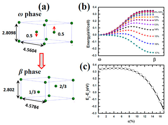 (a) The description of the ω phase to β phase transformation. The red arrow indicates the atomic displacement in the phase transformation. (b) The energy barriers for the ω phase to β phase transformation under different strain. (c) The energy difference between the ω phase to β phase transformation under different strain.