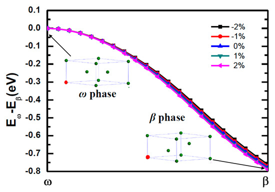 To illuminate the dopant effects on the phase transition between ω phase titanium and β phase titanium, we calculated the atomic diffusion paths and the energy barrier between ω phase and β phase. From Figure 6a, one can find the lattice mismatch between ω phase and β phase is quite small. The large difference between the two structure is that the 2d atoms of ω phase titanium locate at (1/3, 2/3, 1/2) and (2/3, 1/3, 1/2) while these two titanium atom move to (1/3, 2/3, 1/3) and (2/3, 1/3, 2/3) in the β phase, respectively (see the red arrows shown in Figure 6a). The energy barriers are plotted in Figure 6b. Under the ambient environment, the ω phase titanium is very difficultly transformed to β phase titanium due to the fact that the β phase titanium is about 333 meV/cell higher in energy than the ω phase titanium. With the hydrostatic pressure, applied evenly to all parts of the surface of the object. An increase in hydrostatic pressure reduces the volume of the object under pressure, but does not change its shape, this phase transition become easy [25]. As increase of the compressive strain, the energy difference between the β phase and the ω phase decreases. Especially for ε = 15%, the energy difference is almost zero. Further increasing the compressive strain, ω phase titanium would be automatically transformed to β phase titanium because there is no energy barrier between the transition pathways. The Figure 6c indicated the energy barrier between β phase and ω phase with various compressive strain. Our results predicted that the ω to β phase transition appears with 15% compressive strain, consistent with the results for phase transition under hydrostatic pressure [20]. It is impossible to achieve 15% [beyond 150 GPa] smaller volumes in β-phase titanium because corresponding pressures would be similar to those in the Earth core [20]. The β phase has remained stable up to 87.7 GPa [18] and the observation of the ω → β transition in the range of 40~80 GPa using angle-dispersive synchrotron X-ray diffraction [20].