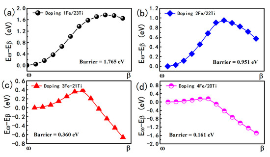 The energy barriers for the Fe-doped ω phase to Fe-doped β phase transformation under different Fe concentration in 2 × 2 × 2 supercell. (a) doping-1Fe in the body center. (b) doping-2Fe in the body centers and other in the top corner. (c) doping-3Fe all in the face centers. (d) doping-4Fe three face center and one body center.