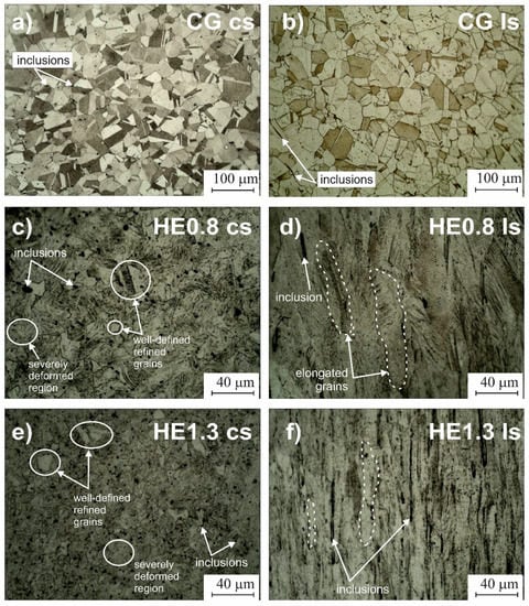 Light microscope observations of the microstructure of 316L stainless steel on the cross-section: (a) CG, (c) HE0.8 (e) HE1.3 samples and on the longitudinal section: (b) CG, (d) HE0.8 (f) HE1.3 samples.
