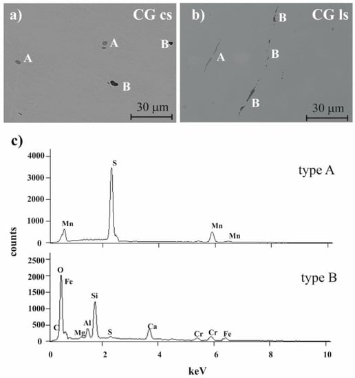 SEM observations of inclusions (a) on the cross and (b) longitudinal sections of CG sample and (c) EDS spectra examples of type A and B inclusions.