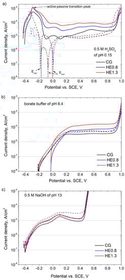 Anodic potentiodynamic polarization curves of the CG, HE0.8, and HE1.3 samples recorded in (a) 0.5 M H2SO4, (b) borate buffer (0.1 M H3BO3 + 0.024 M Na2B4O7) and (c) 0.5 M NaOH on cross-section (solid lines) and longitudinal section (dash lines).