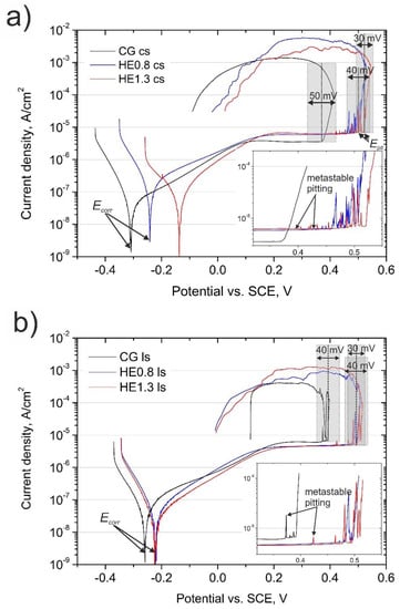 The potentiodynamic curves recorded for the CG and HE samples are shown in Figure 4. The scans were recorded on the cross-section (solid lines) and longitudinal section (dashed lines).