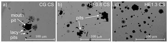 The morphology of the localized attack after potentiodynamic polarization on the tested materials is shown in Figure 6 and Figure 7. The cross-section of the CG sample (Figure 6a) revealed the formation of a typical pit (mouth pit) with a number of small holes (lacy pits) distributed around it. Mouth pits with lacy pits on their peripheries were also observed on the HE0.8 sample (Figure 6b). For the HE1.3 sample, single round pits were observed. An important fact is the lack of lacy pits around the mouth pit; on the longitudinal section of the CG sample, the pits had a round shape (Figure 7a). After refinement, the pits were elongated in the extrusion direction (Figure 7b,c). Also, a higher number of larger pits was observed for the most refined sample (Figure 7c).