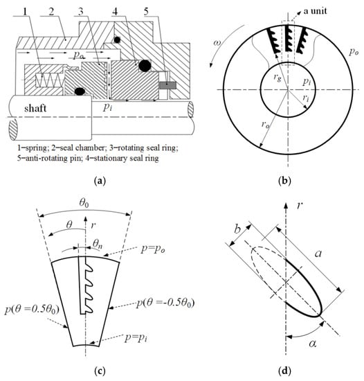 The rapid development of surface texturing technology [3,4,5,6] provides an effective way to improve the friction characteristics of the sealing face. Micro-pored structure and the distribution of laser surface texturing in a seal ring play an important role in terms of mechanical face seal performance, especially the open force, friction torque, and leakage, which significantly influence the seal performance. The first theoretical analysis model of a circle micro-pored mechanical face seal was established and then a series of theoretical and experimental studies on circle micro-pored liquid mechanical face seals were conducted by Etsion’s group and other scholars [7,8,9,10,11,12,13,14,15,16]. Etsion and Yu’s research has shown that circle micro-pored mechanical face seals could reduce friction torque and temperature [8,9,10]. Further study by Etsion and Song showed that a partial micro-pored mechanical face seal had better seal performance [11,12]. The circle micro-pored structure also had a better seal performance when being used in a gas seal, however, the hydrodynamic performance fell below threshold requirements when it was applied in liquid, especially in a high pressure condition [13,14,15,16]. In order to improve the hydrodynamic effect and seal performance, Peng discussed the micro-pored geometric structure effect on seal performance. Numerical analysis has shown that a mechanical seal face with either a column or rectangle section profile of micro-pores exhibited the best performance [17]. Bai and Li investigated the hydrodynamic effect of a single-row inclination ellipse dimple gas seal [18,19,20]. Theoretical and experimental work demonstrated that single-row inclination ellipse dimples had a more significant hydrodynamic effect than the circle dimples.