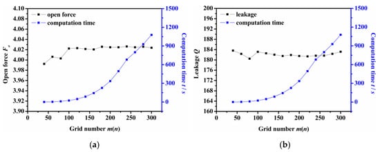 Figure 3 shows the impact of grid number on the computation time and the calculation results of the opening force and leakage rate. Here, m is defined as the grid number along the circumferential direction, and n is the grid number along the radial direction. As the figure shows, the computation time increases as the grid numbers increases. When the grid number m × n was equal to or greater than 100 × 100, the calculated values of opening force and leakage rate remained almost unchanged with the difference between the maximum value and the minimum values were 0.14% and 0.98%, respectively. Therefore, the grid number can be selected as m × n = 100 × 100 to give consideration to the accuracy and efficiency of numerical analysis.