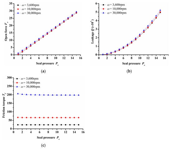 Influence of seal pressure on seal performance: (a) opening force, (b) leakage, (c) friction torque.