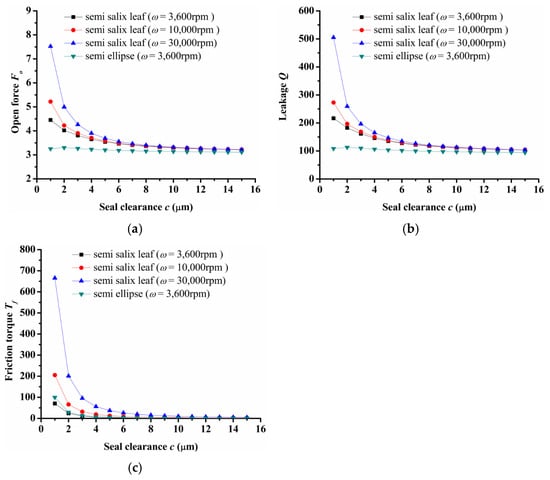 Influence of seal clearance on seal performance: (a) opening force, (b) leakage, (c) friction torque.