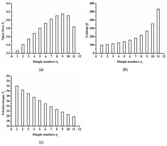 Influence of dimple numbers on seal performance: (a) opening force, (b) leakage, (c) friction torque.