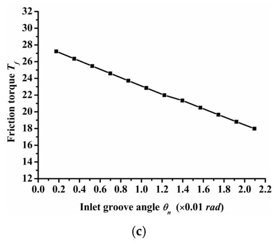 Influence of inlet groove angle on seal performance: (a) opening force, (b) leakage, (c) friction torque.