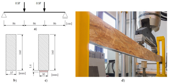 Static scheme and cross-sections of beams: (a) static scheme, (b) cross-section of OSB beam, (c) cross-section of OSB beam reinforced in the tensile zone with CFRP strip, (d) one of the beams during testing.