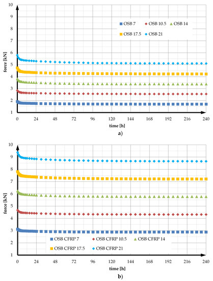 Five bending levels were applied on the load application point, one for each of the beams of both types. The deflections were equal to 7 mm, 10.5 mm, 14 mm, 17.5 mm, and 21 mm. The last deflection corresponds to approximately 95% of the resistance to bending of a beam with no reinforcement. The deflection levels have been introduced into the beam designations. For unreinforced elements they are: OSB 7, OSB 10.5, OSB 14, OSB 17.5, and OSB 21. Whereas for reinforced beams the designations OSB CFRP 7, OSB CFRP 10.5, OSB CFRP 14, OSB CFRP 17.5, and OSB CFRP 21 were adopted. For every bending level, the test lasted 10 days. The results were recorded every minute. Before the main test, each of the beams was forced to a deflection of 14 mm. Subsequently, they were unloaded, after which the rheological tests were performed. All general instructions included in EOTA Technical Reports [56] were followed during the development of the program.