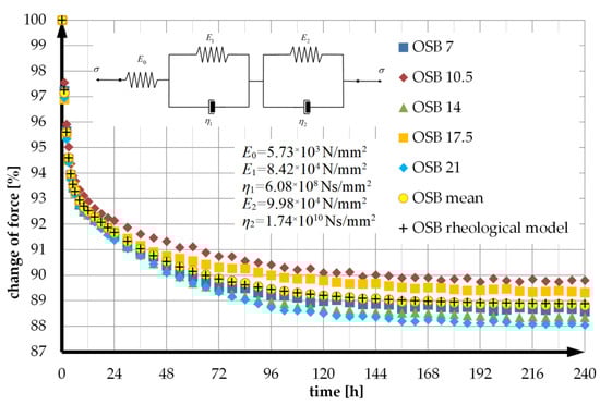 The average ratios of the force values in successive measurements to the force value F0 at time t = 0 from all deflection levels (curve labeled OSB mean in Figure 3) were used for the calculations.