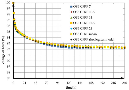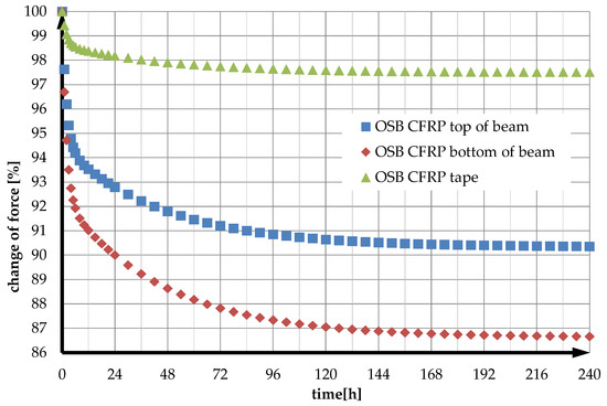 The results are converted into ratios of force reduction to initial force and averaged separately for both beam types for all deflection levels. Experimental relaxation curves were obtained using averaged relative load changes in time for each beam type (OSB and OSB CFRP). Both curves were used to test the theoretical model described herein.