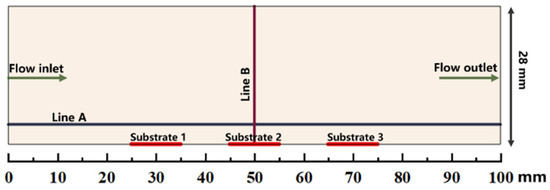 The simulations are performed in a simplified 2D model of a horizontal hot-wall CVD reactor (28 mm in internal diameter and the susceptor length is 100 mm). The distance from the inlet of quartz tube to susceptor is approximately 450 mm. Only the gas phase region is regarded as a numerical domain in this work [21,30]. The schematic of the computational gas phase domain above the susceptor is illustrated in Figure 1. There are 3 substrates (10 mm 10 mm) located on the susceptor. The location of substrate 1 is close to flow inlet along the susceptor, while the location of substrate 3 is close to flow outlet along the susceptor. Horizontal line A is about 2 mm distance above the susceptor, and the vertical line B is from the center of substrate 2 to the upper wall. The line A and line B at succedent context imply the line A and line B indicated in Figure 1.