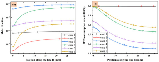(a) MTS molar fraction and (b) MTS consumption rate along line B.