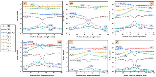 The molar fraction of main species that contained C in the gas phase above the susceptor: (a) case 1; (b) case 2; (c) case 3; (d) case 4; (e) case 5; and (f) case 6.