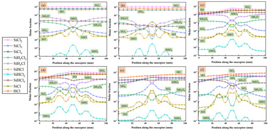 The molar fraction of main species that contained Si/Cl in the gas phase above the susceptor: (a) case 1; (b) case 2; (c) case 3; (d) case 4; (e) case 5; and (f) case 6.