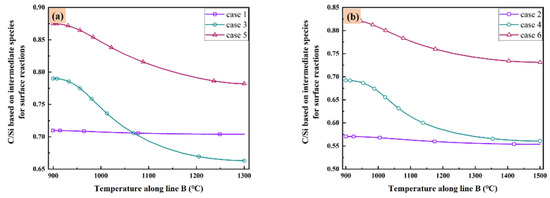 C/Si ratio based on intermediate species for surface reactions as the function of temperature along line B: (a) case 1, case 3 and case 5; and (b) case 2, case 4 and case 6.