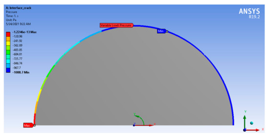 The main idea was to model a finite crack in a horizonless solid that was loaded under invariant traction at infinity. There was a traction free crack tip with a length of 2a at the interface. The region that was modeled is shown by a small circle around the crack tip. In the simulations, the model used a small semicircle around the crack tip with a radius of r = 5 (mm) (see Figure 2). The material parameters of the hyperelastic material models can be seen in Table 1.