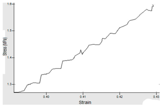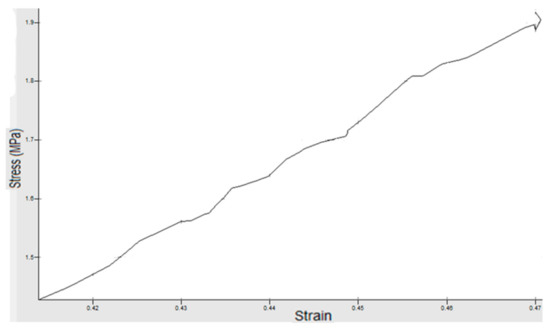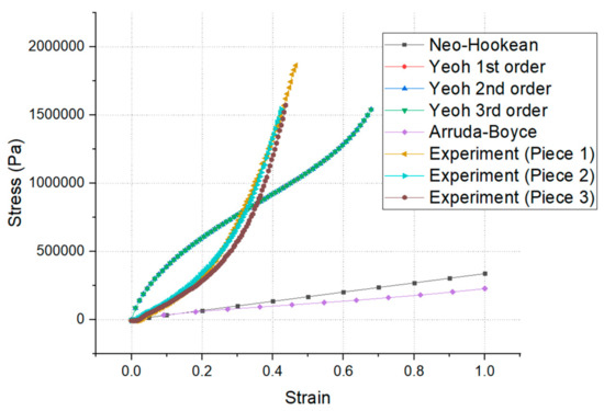 The results of our stress–strain curve analyses are shown in Figure 12. We could see that from values of 0–20% strain, the curves of the neo-Hookean and Arruda–Boyce models were almost identical. We could also see that from the beginning of the test (0–5% strain), the curves produced by our experiments, those of the neo-Hookean model, and those of the Arruda–Boyce model were identical. However, our experiment’s curves and the Yeoh model’s curves converged at a certain point (30% strain for Piece No. 1 and 2, and 32% for Piece No. 3). At 30% strain, the FEM stress result in the neo-Hookean model was 101,350 Pa, the stress in the Arruda–Boyce model was 90,405 Pa, in Yeoh’s first-order model it was 769,490 Pa, in Yeoh’s second-order model it was 725,860 Pa, and in Yeoh’s third-order model it was 778,560 Pa (the largest value stress ). The experimental stress result for Piece No. 1 was 702,325 Pa, for Piece No. 2 it was 673,949 Pa, and for Piece No. 3 it was 569,645 Pa. According to hyperelastic theory [27], Figure 12 shows that the Yeoh models were better than the neo-Hookean, and Arruda–Boyce models. Yeoh’s third-order model was the best model (the largest value stress ).