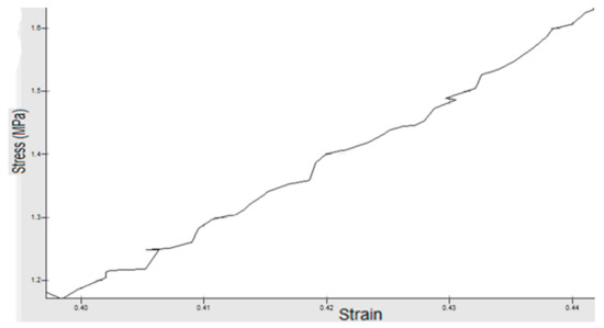 The test samples were cut out from the rubber jolt according to the ISO 23529 standard (see Figure 4). The specimens were tested under different speeds and forces on an LF2373 friction tester. The specimens 1, 2 and 3 were tested under speeds (),, and , and forces , , and , respectively (see Figure 5, Figure 6, Figure 7). The maximum stresses and strains for Piece No. 1 were 1,865,143 Pa and 0.469864 (see Figure 5), for Piece No. 2 they were 1,543,659 Pa and 0.4289942844 (see Figure 6), and for Piece No. 3 they were 1,573,443 Pa and 0.441718 (see Figure 7), respectively.