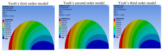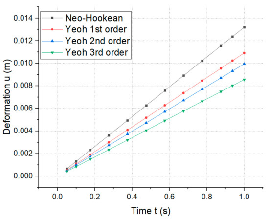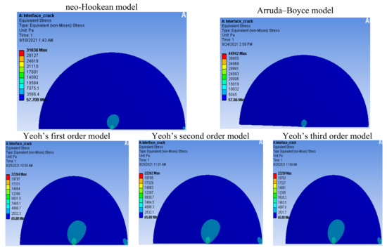 We found the maximum stress in the Arruda–Boyce (44,942 Pa), neo-Hookean (31,636 Pa), Yeoh’s first-order (22,264 Pa), Yeoh’s second-order (22,262 Pa), and Yeoh’s third-order (22,259 Pa) models, as shown in Figure 8. From the existing theory concerning hyperelasticity [27], Figure 8 shows that the Yeoh models were better than the neo-Hookean model, and that the neo-Hookean model was better than the Arruda–Boyce model because although they have the same boundaries, the stress at the crack in the Yeoh models was smallest. In Figure 9, we can see the maximum deformation along the y-axis for the Arruda–Boyce model (0.18471 m), as well as the maximum stress in the neo-Hookean model (0.013205 m), Yeoh’s first-order model (0.010925 m), Yeoh’s second-order model (0.0099555 m), and Yeoh’s third-order model (0.0085625 m). According to the theory of hyperelastic materials [27], we could see that the Yeoh models were better than the neo-Hookean models, and that the neo-Hookean model was better than an Arruda–Boyce model. From the two cases shown above, we could see that Yeoh’s third-order model was the best model, as the models had the same boundaries, but the deformation by the crack in Yeoh’s third-order model was the smallest.
