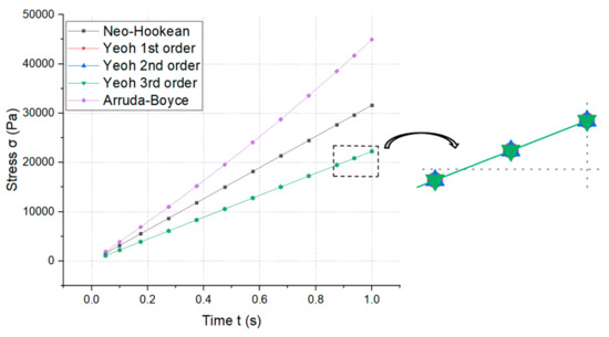 The finite element simulations were carried out on the basis of the neo-Hookean, Yeoh, and Arruda–Boyce models using the parameters shown in Table 1, and a Poisson’s ratio = 0.49. The Poisson’s ratio of the elastomeric accoutrements used in the model was near 0.5, but in reality it is unlikely to actually equal 0.5 [25]. Similar elastomers show nonlinear reversible pliability for moderate distortions.