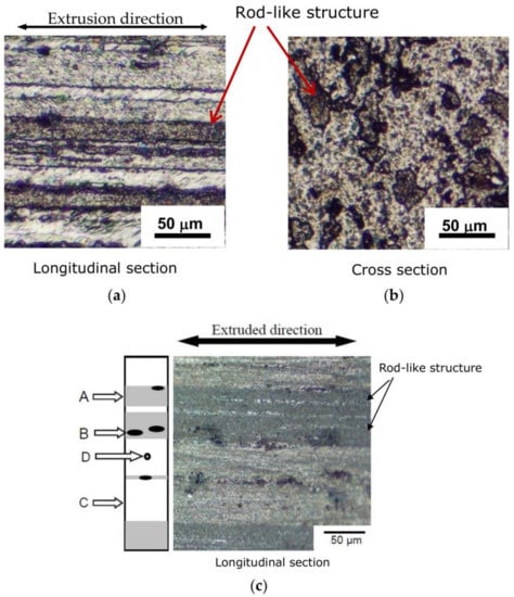 To observe the rod-like structure more clearly, a more detailed photograph of the microscopic structure in the longitudinal section, after etching obtained via optical micrography, is shown in Figure 1b. As presented in the figure, a light-blue rod-like structure (black arrow in the figure) with a width (diameter) of 20–70 μm appeared parallel to the extrusion direction.