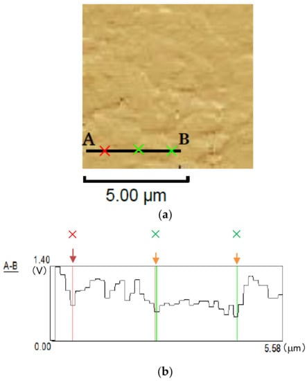 Figure 2 shows an example of the AFM results. As shown by the AFM image in Figure 2a, some grain boundaries can be observed due to the unevenness of the replica film. However, grain boundaries due to etching only were unclear. Therefore, the following method was used. The AFM needle was scanned along line segments A to B, as shown in Figure 2a. Figure 2b shows the relationship between the excitation voltage and the moving distance when scanning the needle. A voltage drop was observed at three locations (i.e., positions marked with ×, ×, and × in Figure 2a) and was assumed to represent grain boundaries on the line segments from A to B (Figure 2b). Therefore, these points were regarded as the grain boundaries.