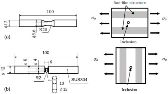 Shape and dimensions of fatigue specimens; relationship between σa and rod-like structure (schematic diagram). (a) Specimen P; (b) specimen V.