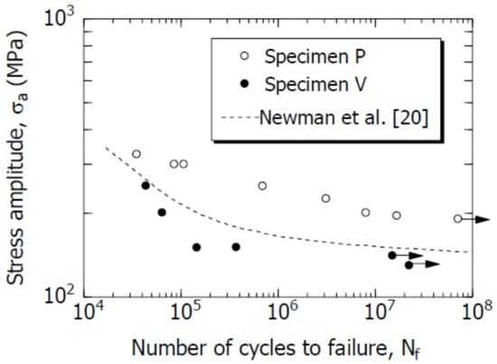 Figure 4 shows the S–N curves of specimens P and V. For comparison, the S–N curve (broken line in the figure) of the rolled Al alloy 2024T-3 reported by Newman [20] is included in the figure. The arrows in the figure indicate that the specimen is not broken, but the experiment has been stopped. As shown in the figure, the fatigue limits of specimens P and V (σa at Nf = 107) were 190 and 140 MPa, respectively. Therefore, the fatigue limit value of specimen P was 50 MPa greater than that of specimen V. Furthermore, based on a comparison between specimen V and the rolled Al alloy, it was observed that the S–N curves of both were similar.