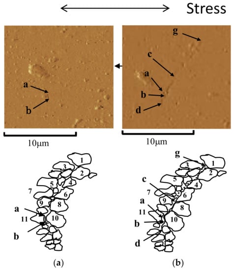 Figure 5a,b show the AFM images for N/Nf = 10% and 31% for specimen P, respectively, where N is the number of stress cycles. The arrangement and shape of the crystal grains near the short cracks are shown at the bottom of each image. The arrangement and shape of these grains were analyzed based on the AFM images and the excitation voltage distribution (as explained in Section 2.3).