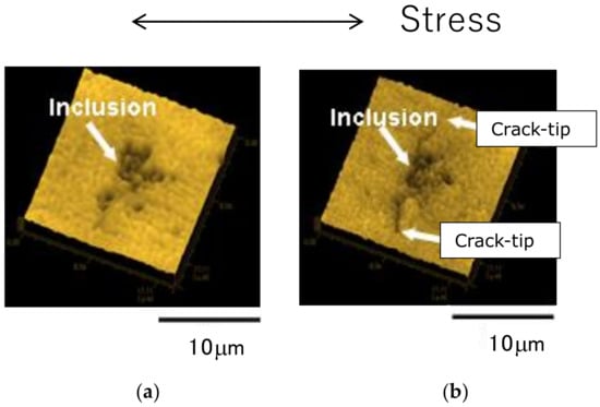 Using specimen V, the FCI and FCG behavior of short surface cracks were continuously observed at σa = 150 MPa, which is slightly higher than the fatigue limit of 140 MPa. Figure 6 shows an example of the results obtained from an AFM image of the replica film. Figure 6a,b correspond to N/Nf = 0% and 16%, respectively. Here, Nf was 1 × 105 cycles. In the AFM image before the fatigue loading shown in Figure 6a (N/Nf = 0), inclusions (Cu–Mg-based intermetallic compounds) were observed, as indicated by the arrows. At N/Nf = 16%, as shown in Figure 6b, fatigue cracks that initiated from the inclusion (arrows in the figure, Cu–Mg-based intermetallic compounds) developed to a final length of 12 μm. The da/dN at this time was 3.75 × 10−10 (m/cycle). A similar result for FCI has been obtained for magnesium alloys [17].