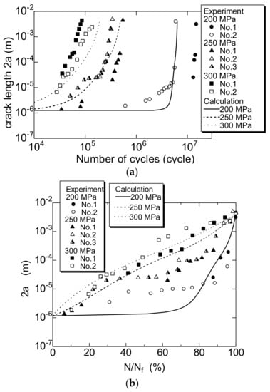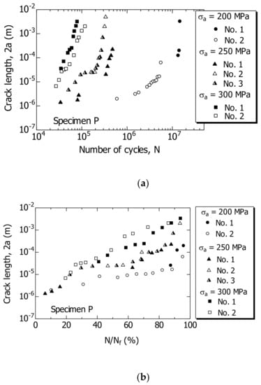 Figure 7a,b show the relationships 2a–N and 2a–N/Nf, respectively. Multiple surface cracks occurred and developed further in the unnotched smooth specimen. Indications No. 1 to No. 3 in the figure are shown to distinguish a plurality of cracks.