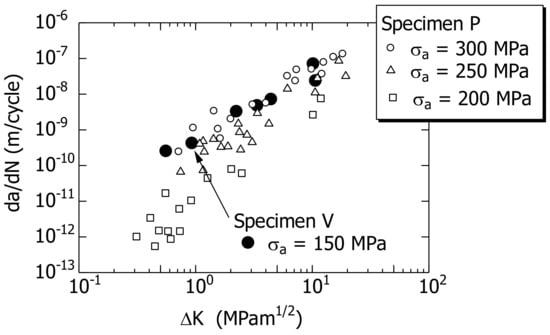 Figure 9 shows the da/dN−ΔK relationships of specimens P and V. da/dN was calculated using Figure 7 and Figure 8, and ΔK was calculated using Equation (1) for surface cracks.