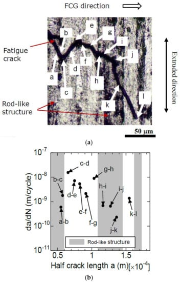 Figure 10a shows the interaction between the rod-like structure and fatigue crack. As shown, the crack width was wider than the actual crack width, owing to the effect of the etching. The black striped pattern in the vertical direction in the figure is the rod-like structure, and the gray pattern is the Al matrix. Symbols “a” to “l” are included in the figure to measure the da/dN of each section (local position). The crack developed from the left to the lower right in the figure, and the tip of the crack was “l”. At this time, crack length was approximately 170 μm. The extrusion direction is shown in the figure. The crack did not grow in a direction perpendicular to the load direction (extrusion direction); instead, they grew locally in a diagonal direction. Therefore, the crack was projected on a plane orthogonal to the load direction in order to measure its length.