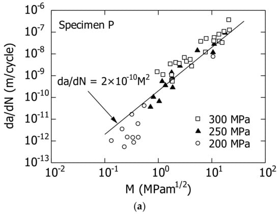 When the da/dN–M relationships shown in Figure 11 were approximated using Equation (7), Equations (8) and (9) were obtained for specimens P and V, respectively.