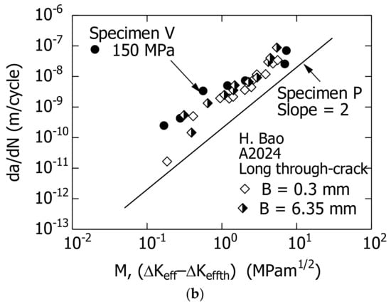 Figure 11b shows the da/dN–M relationship (σa = 150 MPa) for specimen V. Additionally, the da/dN–M relationship of specimen P (straight line in Figure 11a) is shown. For comparison, the da/dN–(ΔKeff–ΔKeffth) relationship [29] obtained by Bao for the long penetrating crack of A2024 is shown in the figure. He conducted FCG experiments with specimen thicknesses B of 0.3 and 6.35 mm.